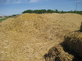 This week we had fourteen round bales delivered to the farm. Two flax straw bales and the rest are barley straw bales. The bales are a couple of years old and not suitable for too many uses, but they are perfect for us. We were able to use a straw shredder, so the day they were delivered we shredded all 14 bales. The pictures below are the piles of straw awaiting to be spread as mulch throughout the gardens this year. The flax straw will be used on the perennials and shrubs, as it takes a long time to break down and the barley straw will be used on the annual crops.